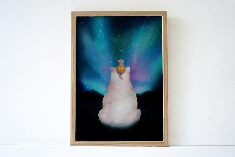 IJsbeer en muis die kijken naar het Noorderlicht! Een poster met prachtige kleuren voor aan de muur: mooi om een kinderkamer, woonkamer of andere ruimte op te vrolijken en sfeer te geven. De poster wordt in kleine oplages gedrukt in Nederland en voorzien van een handtekening op de achterkant. Leuk om cadeau te geven voor een verjaardag of met de feestdagen!